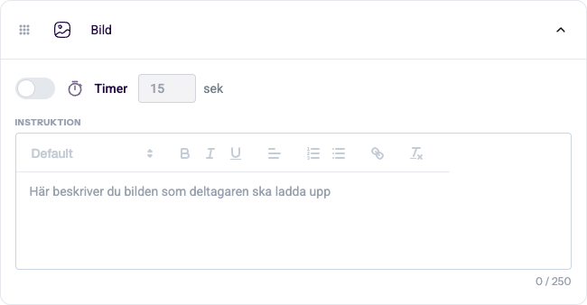Formatet foto/video ger deltagaren möjlighet att delta i din tävling genom att ladda upp sin bästa (eller sämsta) bild eller klipp. Detta är ett format som människor älskar att delta i och som kan ge mängder med bidrag! Passar utmärkt på teman barn, husdjur, motor eller annat nischat ämne.