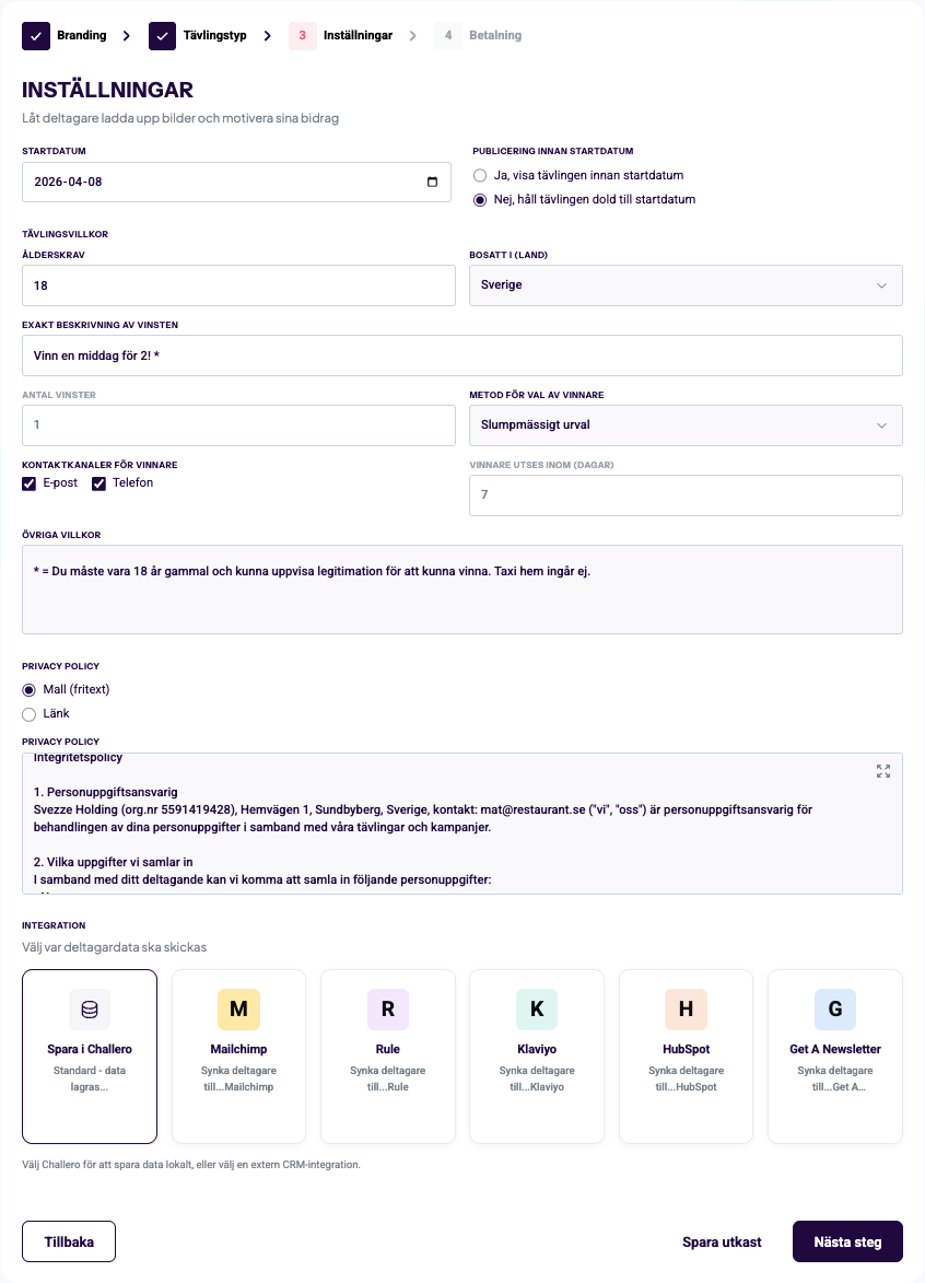 I det tredje steget har dina grundläggande inställningar för tävlingen. Här finner du bland annat tävlingsvillkor, dina privacy policys och val av integration gentemot möjliga CRM, CDP eller nyhetsbrevsplattformar. Väljer du att 'Spara i Challero' så kommer all deltagardata att finnas tillgänglig för export i plattformen. Du har här även möjlighet att välja startdatum för tävlingen, om den ska ligga som "Startar snart" i appen och hur länge den ska ligga aktiv.