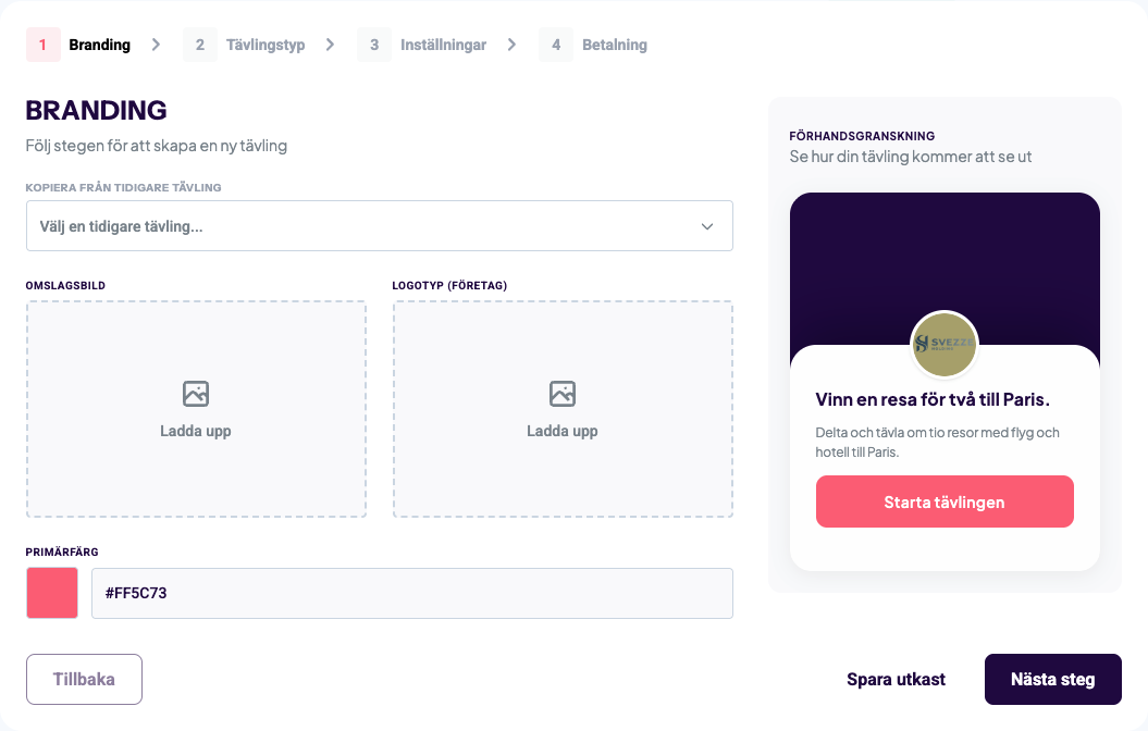 I första steget av att skapa din tävling då skapar du det visuella i form av omslagsbild, logo och en primärfärg. Ett hett tips är att välja en omslagsbild som säger något om din verksamhet eller ännu hellre något om vinsten i tävlingen.