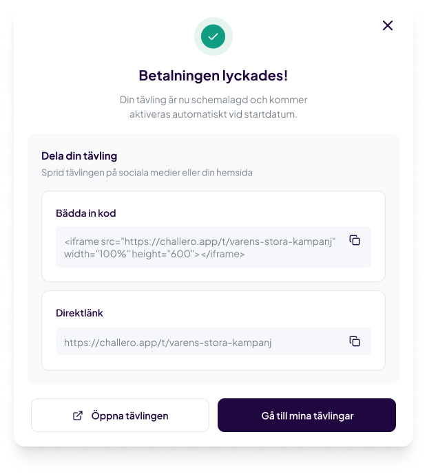 När tävlingen är betald så publiceras den i appen, men här är det viktigt att du själv sätter bollen i rullning och sprider din tävling. Använd dig av ditt nyhetsbrev, sätt upp lite annonsering där du delar länken och skapa även en QR-kod av länken som du använder i din fysiska miljö om du har en sådan. Varje deltagare skapar ringar på vattnet som gör det möjligt för nya deltagare och målgrupper att hitta dig.