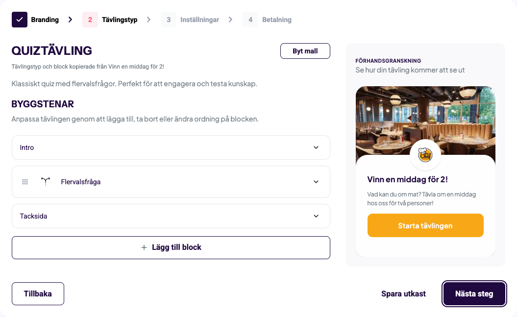 I steget 'Tävlingstyp' väljer du format på din tävling. Du kan välja mellan att skapa ett quiz med flervalsfrågor där deltagaren ska svara rätt på en fråga, du kan skapa ett memory där användaren ska hitta de rätta paren på tid eller så kan du skapa foto/videotävlingar där användaren ska ladda upp sin bästa bild eller sin bästa video på ett tema. Du kan även skapa en kombination av de olika delarna genom att mixa block i editorn.