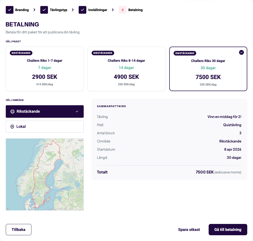 Avslutningsvis så har du steget betalning som innebär att du väljer hur länge du vill att din tävling ska vara aktiv och var den ska exponeras och vara tillgänglig.
